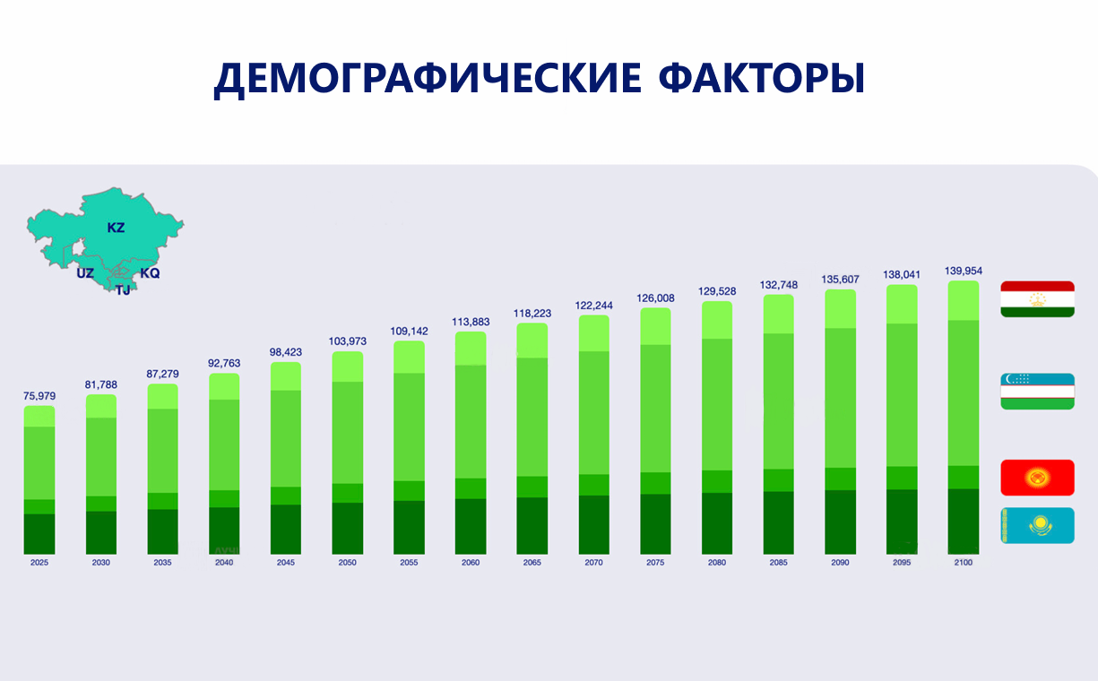 По прогнозам, к 2075 году совокупная численность населения Узбекистан, Казахстан, Таджикистан и Киргизия достигнет 129,5 млн человек — показателя, сопоставимого с численностью населения РФ, а в дальнейшем и превышающего её.
