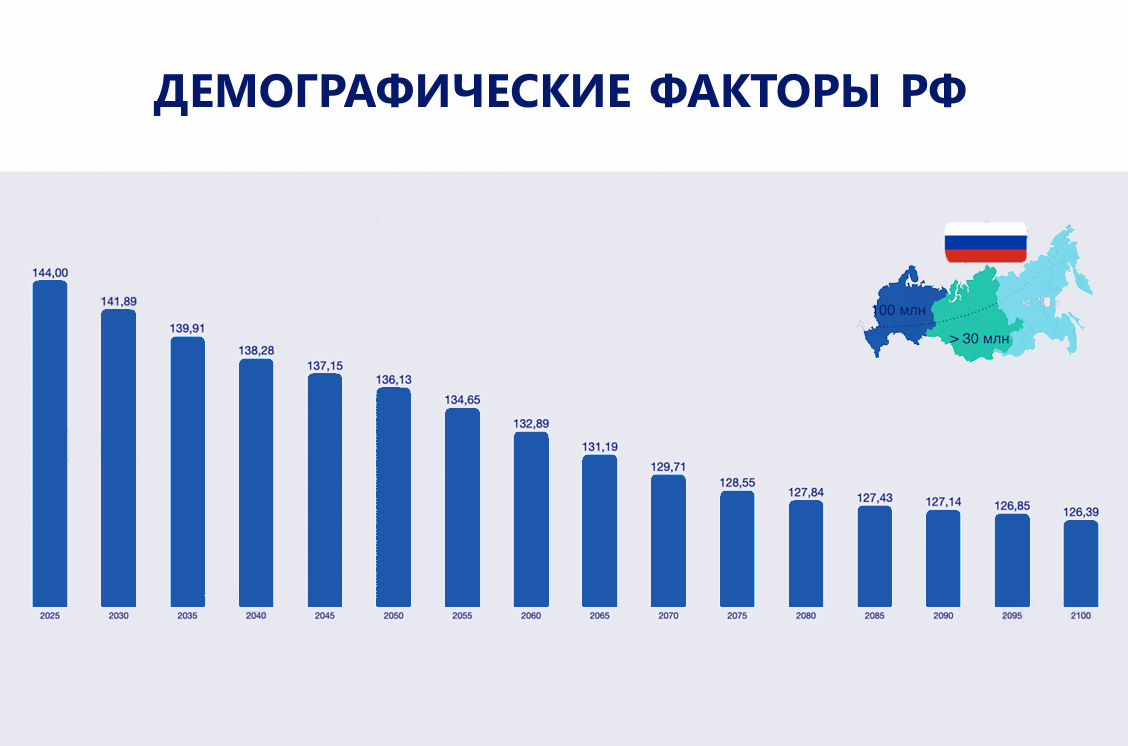 Ожидается сокращение населения на 4,09 млн к 2035 году и ещё на 2,76 млн к 2045 году. Это означает прямое уменьшение ёмкости внутреннего рынка и снижение потенциала экстенсивного роста потребления. (Источник: https://www.populationpyramid.net/russian-federation)